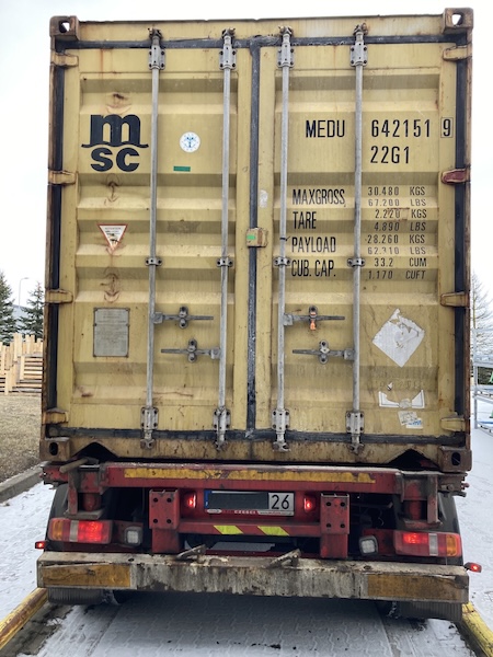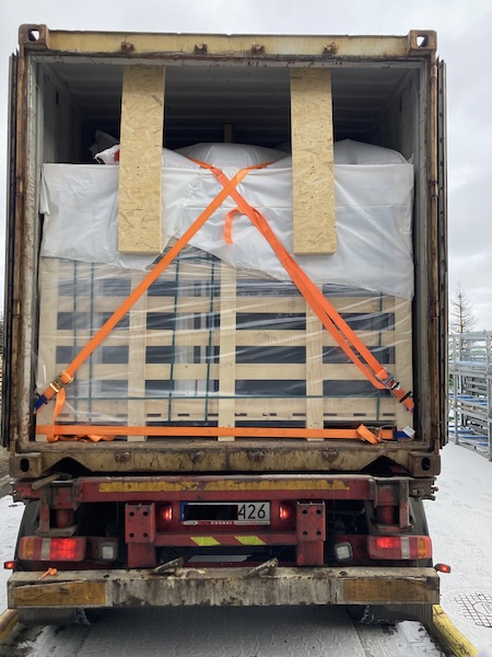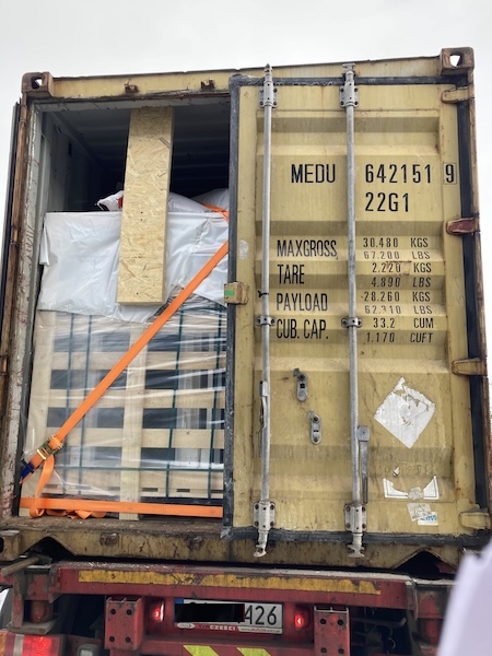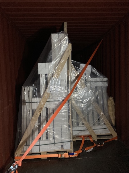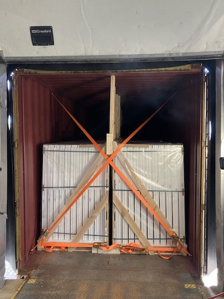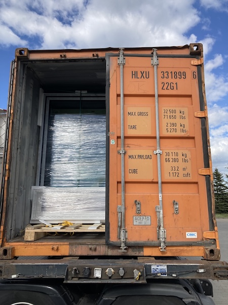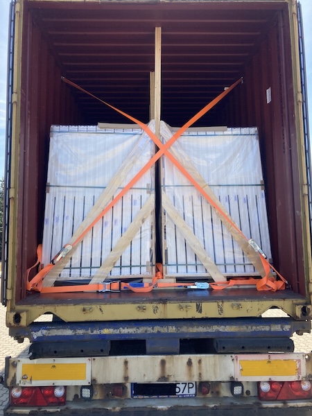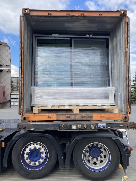 Inside the container, we add air cushions to absorb shocks and prevent movement. Window racks are strapped down and reinforced with OSB boards, ensuring the pallets stay firmly in place throughout the journey.